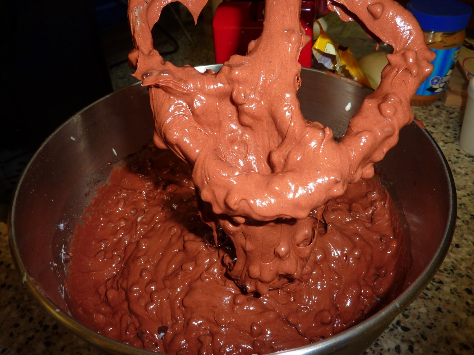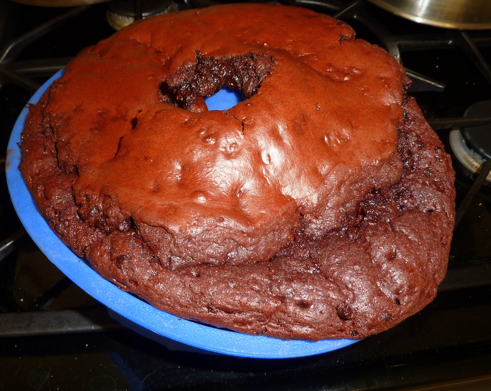 Mix in 2 cups chocolate chips. (I know, it's really hard not to lick off all the batter. Since this recipe makes so much, feel free to stick your finger in.)Pour batter into prepared pan. Bake in the preheated oven for an hour, or until a toothpick inserted into the center of the cake comes out clean. Cool 10 minutes in the pan, then turn out onto a wire rack and cool completely. (The original recipe said 40 to 50 minutes, but there's just no way. A full hour is what this cake needs. Maybe the cooker just couldn't resist the yummy smells coming from the oven?! Try to resist for an hour, because then the cake will be perfect!) Look how big it is! More to enjoy!