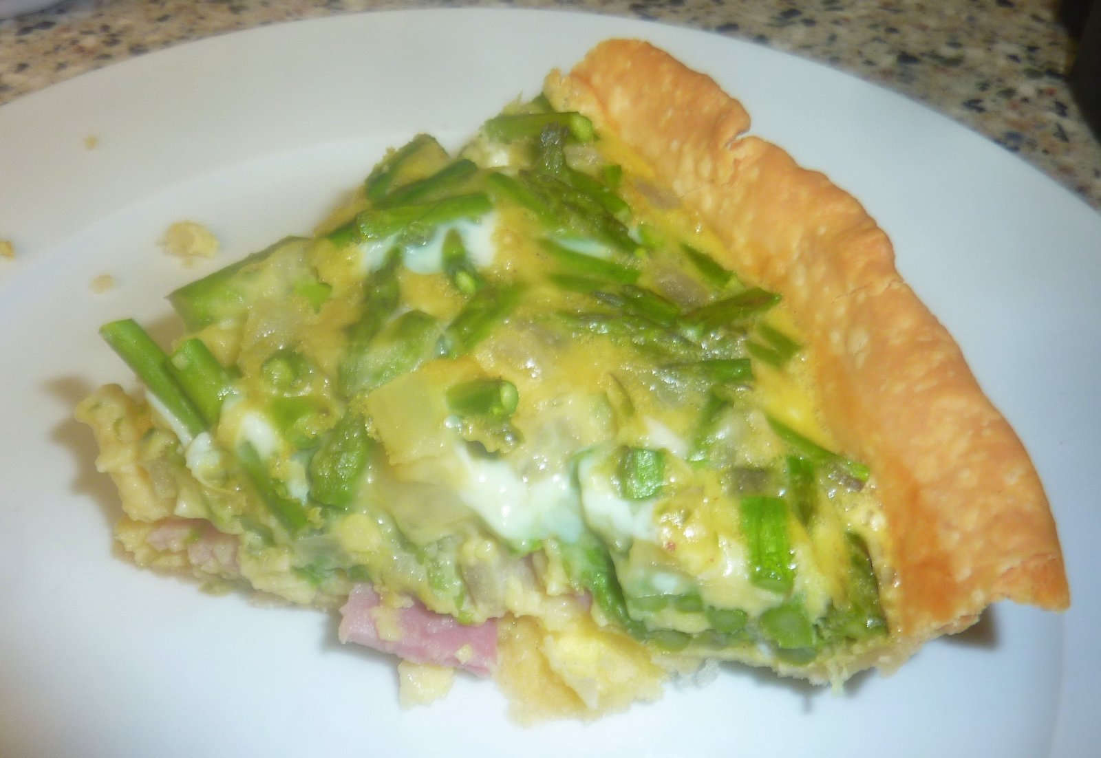 The other day I learned to be at peace with pie crust. That may sound funny, but I used to be one of those annoying people who refused to eat the pie crust, because I was afraid it would make me fat. Well, I now have three points to make: One, I am now already fat! Two, not all pie crusts are fattening. And three, pie crust tastes good, so now I eat it. Not only do I eat it, but I cook it! I made an asparagus and ham quiche the other day. Isn't it pretty?