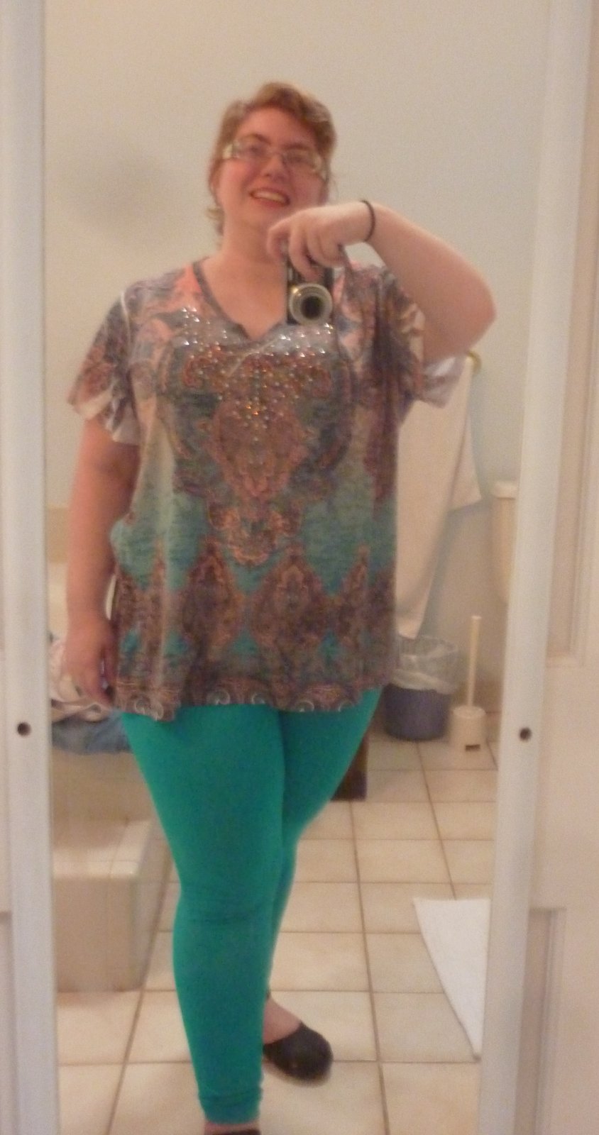Now, because it is Fatshion February, here is another picture of me:The outfit is very similar to my last one, except the main color is turquoise. (leggings: have no idea, shirt: Stein Mart, shoes: Abbadabba's - Merrill's)