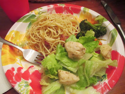 Dinner was fried spaghetti with bacon, roasted carrots and broccoli, salad, and lemon rosemary chicken. My favorite part was the chicken, which was incredibly moist and juicy.