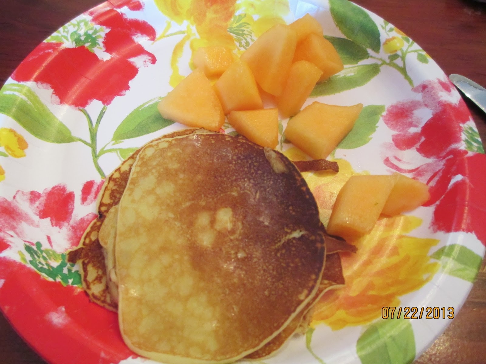 My stomach was hurting, so I didn't eat as many as I normally do, but I enjoyed them all the same! He doesn't use baking soda, so they don't rise and they resemble crepes more than the average pancake. They're thin and buttery and yummy. A side of cantaloupe sweetens the meal.